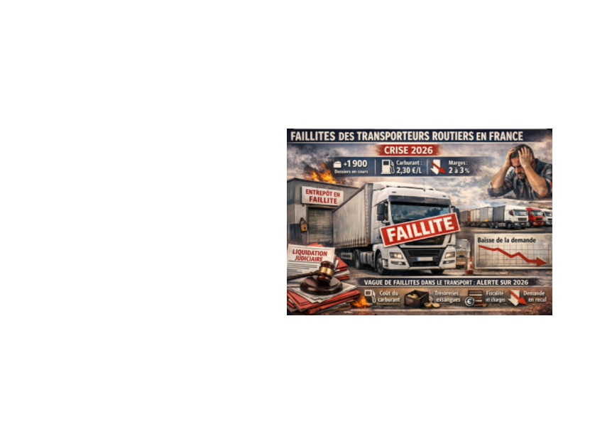 Faillites de transporteurs routiers en France : une année 2026 qui démarre sous tensionDepuis le 1er janvier 2026, les défaillances de transporteurs routiers en France s’accélèrent nettement, confirmant une crise déjà profonde en 2025. Les liqu...