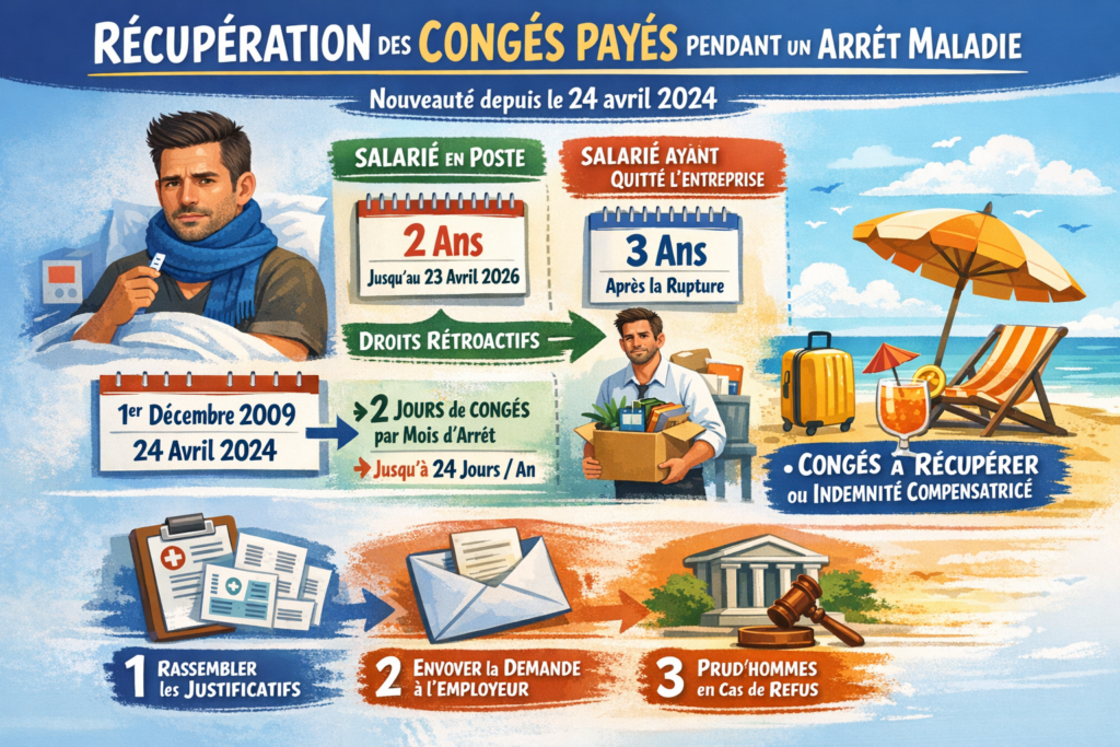 Les salariés en poste disposaient de 2 ans, à partir du 24 avril 2024, pour réclamer des jours de congés supplémentaires ou une indemnisation. Passé le 23 avril 2026, les droits sur les arrêts antérieurs à cette date seront perdus. Par exemple, un salarié encore en poste ayant été en arrêt maladie en 2015 peut réclamer ses congés jusqu’au 23 avril 2026.